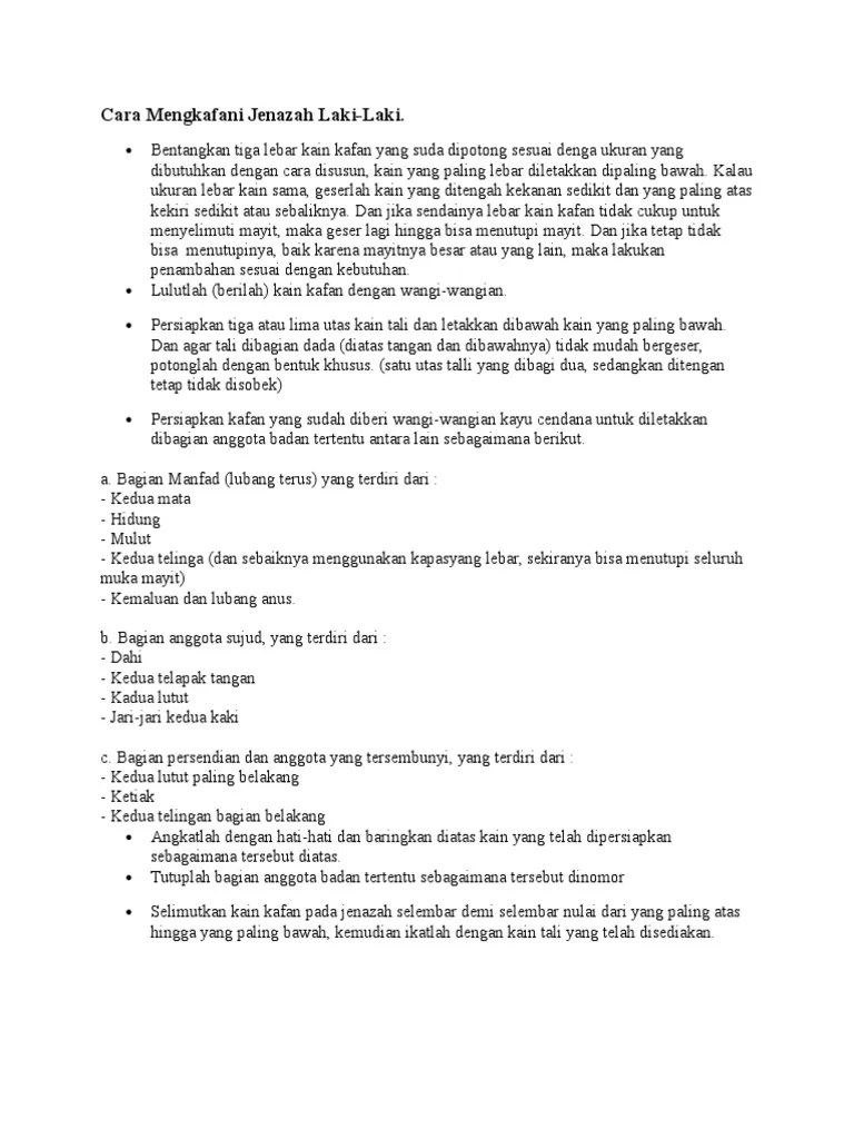 Sunnah (mandub), yaitu suatu perbuatan yang apabila dikerjakan, pelakunya akan mendapat pahala, tetapi apabila ditinggalkan tidak mendapat siksa. Muslim mempunyai batasan dalam pemakanan mereka. Melansir laman askthescholar.com, ulama asal kanada, syekh ahmad kutty, menjelaskan seorang suami boleh memandikan jenazah istrinya sebagaimana seorang istri boleh memandikan suaminya yang sudah meninggal. Angkat mayat dan baringkan di atas kain kafan. Feb 27, 2014 · kursus pengurusan jenazah 3.2.3.