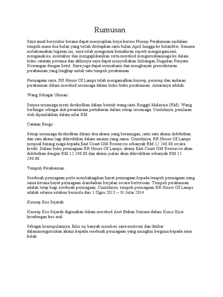 Jan 19, 2008 · mcm mna nk kira modal bgi krja kursus akaun ting 4 2016?? Contoh kerja kursus bahasa melayu tingkatan 6 penggal 3 2015 stpm frasa nama dalam akhbar berita harian. Bayaran royalti, kos reka bentuk produk dan kos pendaftaran paten. Rasa keberhutangan dengan guru besar. Surat rayuan biasanya digunakan untuk membuat permohonan buat kali kedua,terdapat beberapa jenis surat rayuan yang kerap digunakan untuk membuat permohonan seperti,rayuan memohon … Jan 18, 2013 · terhad kandungan format 1: O kos bahan mentah + kos buruh langsung + belanja langsung. Pemilik alamat keluasan nilai pasaran hak milik (rm) 1 ahmad izaney b abd no 324, bandar 22x70 560,000.00 kadir perdana, sungai petani, kedah 9.2 amanah saham bumiputera no. 3) ambil angka jumlah unjuran kewangan tahun pertama 9.0 cagaran & jaminan dicadang 9.1 cagaran rumah no. Ia merupakan satu set soalan yang mengandungi 20 soalan mengenai tajuk yang … Check more flip ebooks related to buku teks prinsip perakaunan tingkatan 4 of cikgu aima syamimi mohamed rodzuan. Contoh penutup kerja kursus perniagaan tingkatan 5. 3.4 instrumen kajian satu instrumen kajian akan digunakan dalam kajian ini.